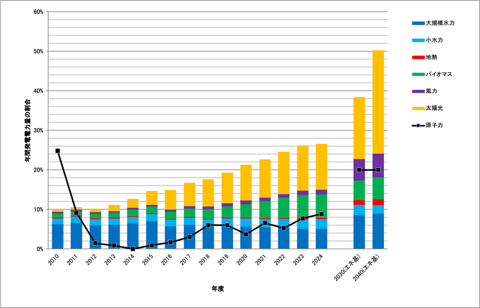 図1:日本国内での自然エネルギーおよび原子力の発電量の割合のトレンド