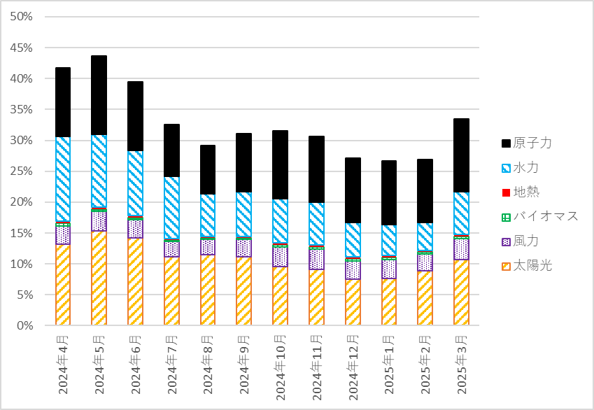 図2: 日本国内の全発電電力量に占める月別の自然エネルギーの割合(2024年度)
