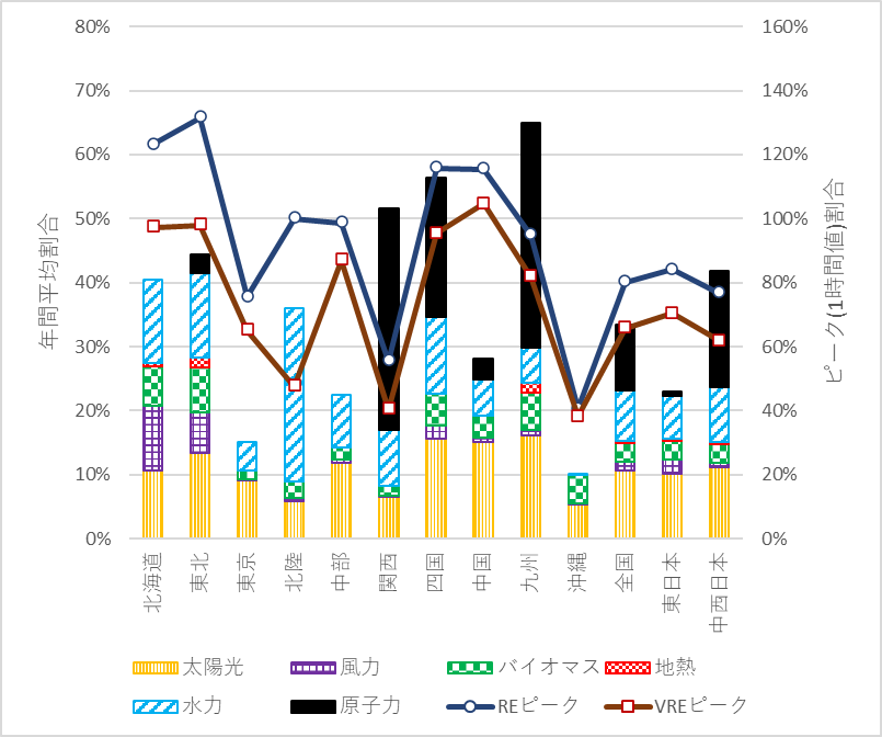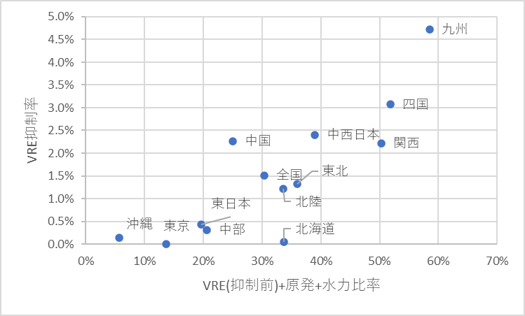 | エリア | RE比率(抑制後) | VRE比率(抑制後) | VRE比率(抑制前) | VRE出力抑制率 | 原発比率 | 水力比率 |