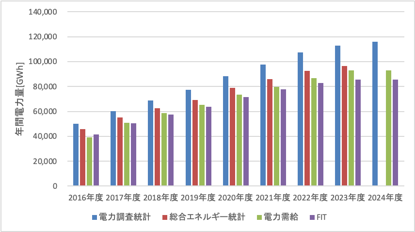 図3: 統計データによる日本国内の太陽光発電の年間電力量の比較