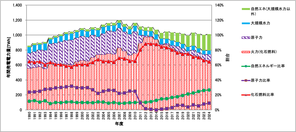 日本国内の電源構成の推移を1990年代から図5に示す。総発電電力量はピーク時(2007年)から約2割減少しており、2023年度も前年度から減少した。自然エネルギーの年間発電電力量は、2010年度まで総発電電力量の10%で推移してきたが、2024年度までに26%と倍増した。3.11以降、原子力発電の発電電力量は激減し、3.11前の25%以上から約9%と3分の1程度となっている。化石燃料による火力発電の割合は、3.11後に約90%にまで上昇したが、65%程度に減少してきている。