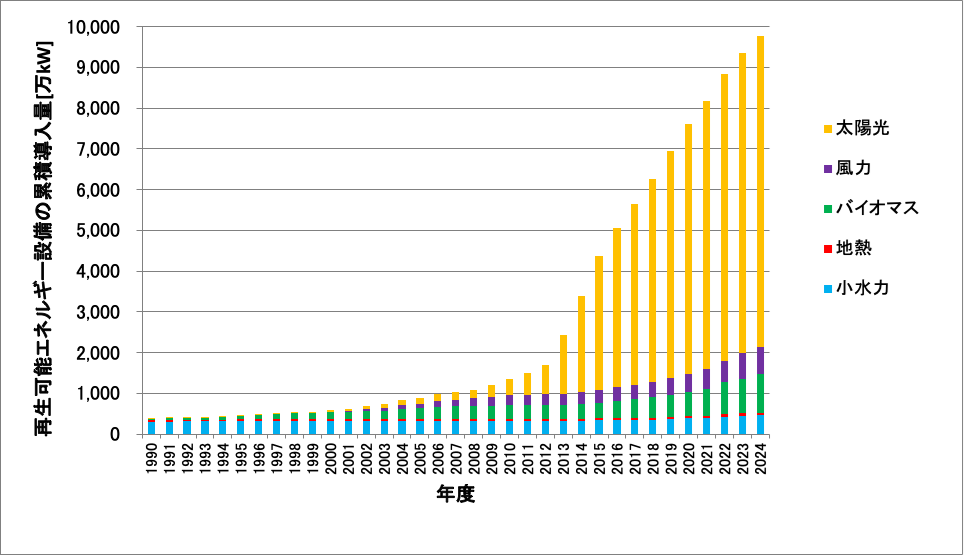 図6: 日本国内の自然エネルギー発電設備(大規模水力を除く)の累積導入量の推移