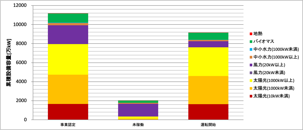 | 電源 | 事業認定[万kW] | 未稼働[万kW] | 運転開始[万kW] | 運転開始率 |