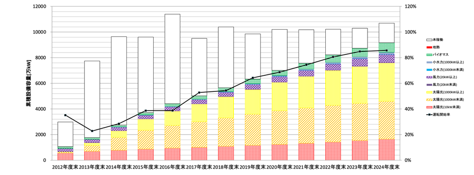 図7: FIT制度における設備の事業認定、導入量(運転開始)および未稼働設備(2023年度末)