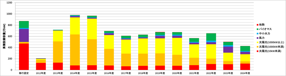 年度毎のFIT制度による年間導入量の推移をみると2014年度が太陽光を中心に1000万kW近くに達して最も大きかったが、その後に減少に転じて2017年度からは年間600万kWから700万kW程度の導入量となっていたが、2023年度は約500万kWまで減少した (図9)。太陽光発電については、2020年度までは500万kW以上の年間導入量だったが、新規の買取価格も急速に低下し、大規模な案件に対する入札制度や2022年度からFIP制度も始まったことから、2021年度からは400万kW台に、2023年度は300万kWまで減少した。一方、これまで導入量が抑えられてきた風力については年間導入量が増加する傾向があり、これまで風力発電は約50万kW以下で推移してきたが、2022年度には年間100万kW以上が新規に導入された。バイオマス発電も2017年度以降、40万kW以上導入され、2022年度は最大の年間131万kWが導入されたが、2023年度は約60万kWに留まった。地熱発電は2023年度に約4万kWが導入され、2019年度の約5万kWに次ぐ導入規模となった。